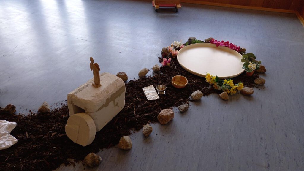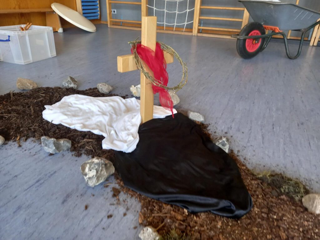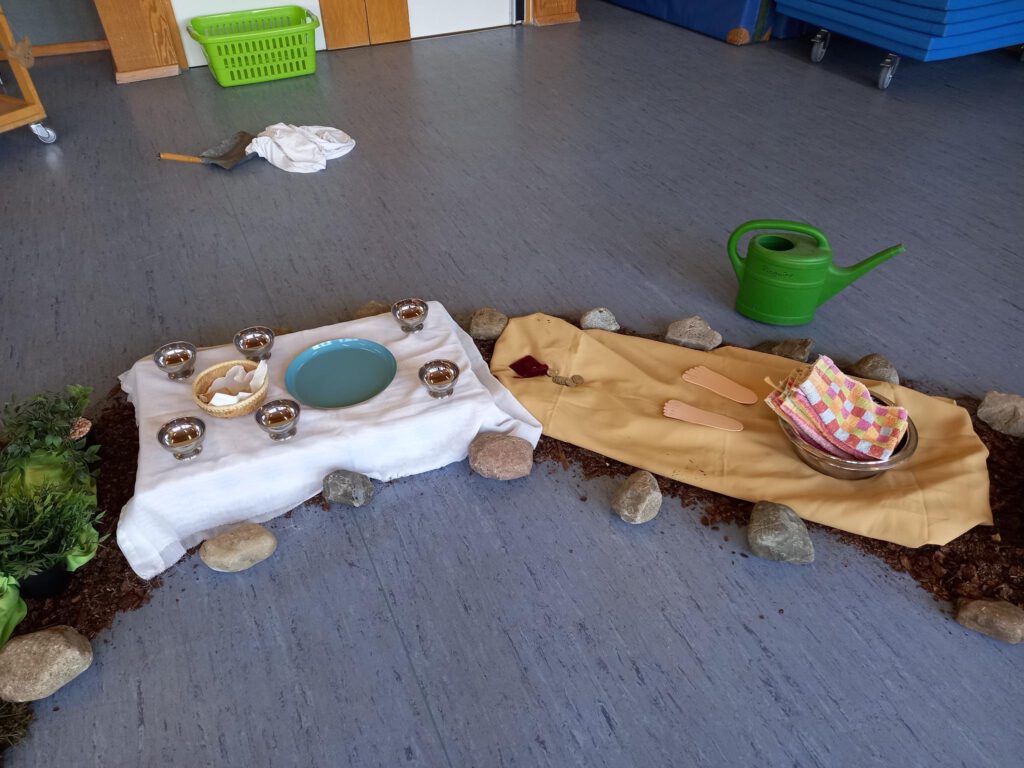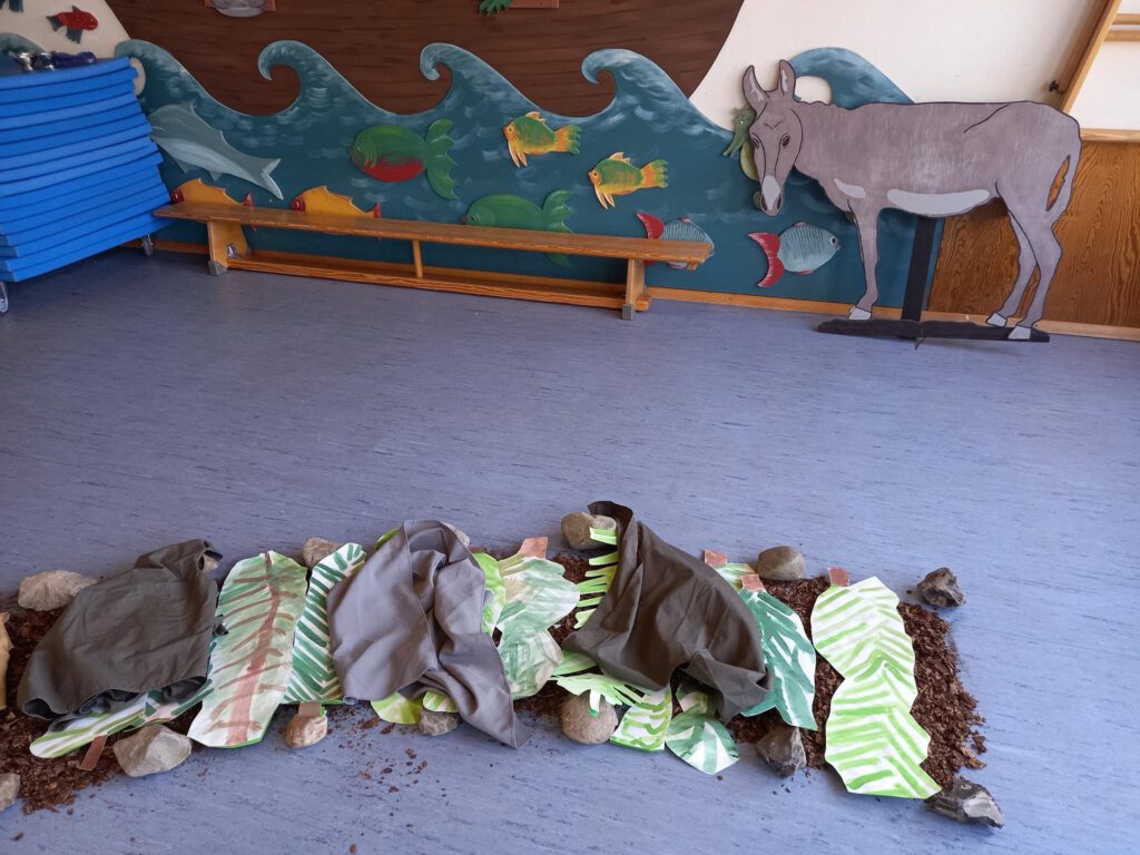In der Osterzeit haben wir mit den Kindern die Ostergeschichte genauer angesehen und kreativ erlebbar  gemacht. Jeden Tag wurde der Weg mit einem neuen Teil der Geschichte gefüllt. Von der Fußwaschung und dem gemeinsamen Abendmahl bis hin zur Verhaftung und Wiederauferstehung wurden die Kinder mit hineingenommen in das Wunder von Ostern.